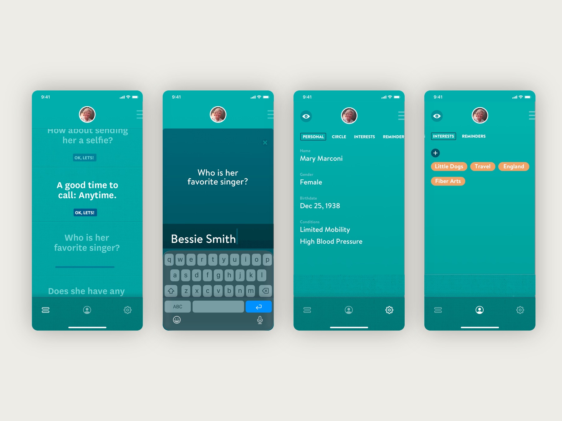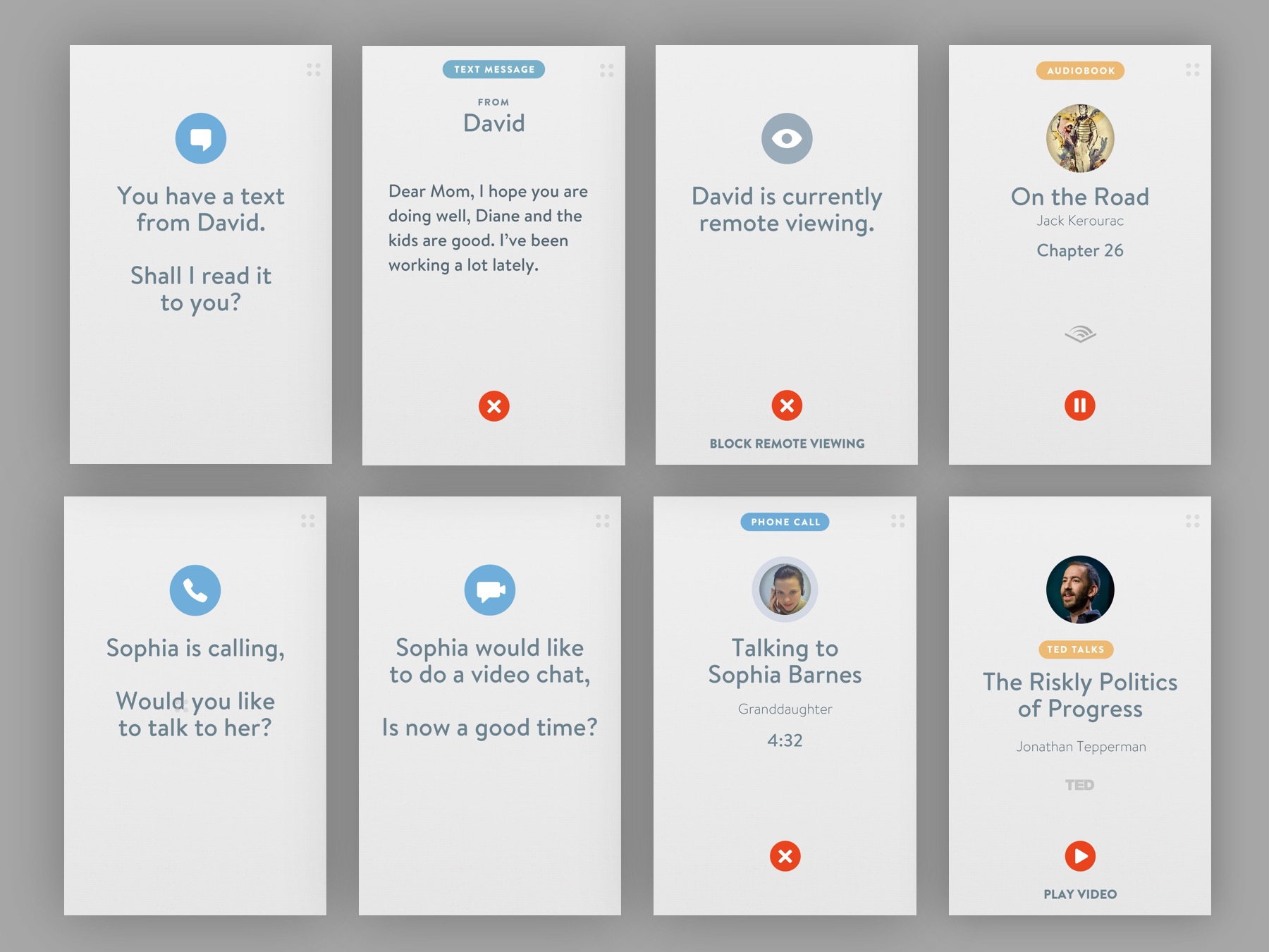 In addition to designing clear color and scale for the tablet UI, I introduced the concept of a distance-adaptive interface, where text size, voice volume, and conversational pace adjust to the user’s proximity—making Elli-Q feel more natural and responsive. I also shaped the companion app to be proactive for caregivers, enabling the system to notify them if the elder was inactive for long periods (e.g., watching TV for hours), prompting check-ins that encouraged more meaningful social engagement.
